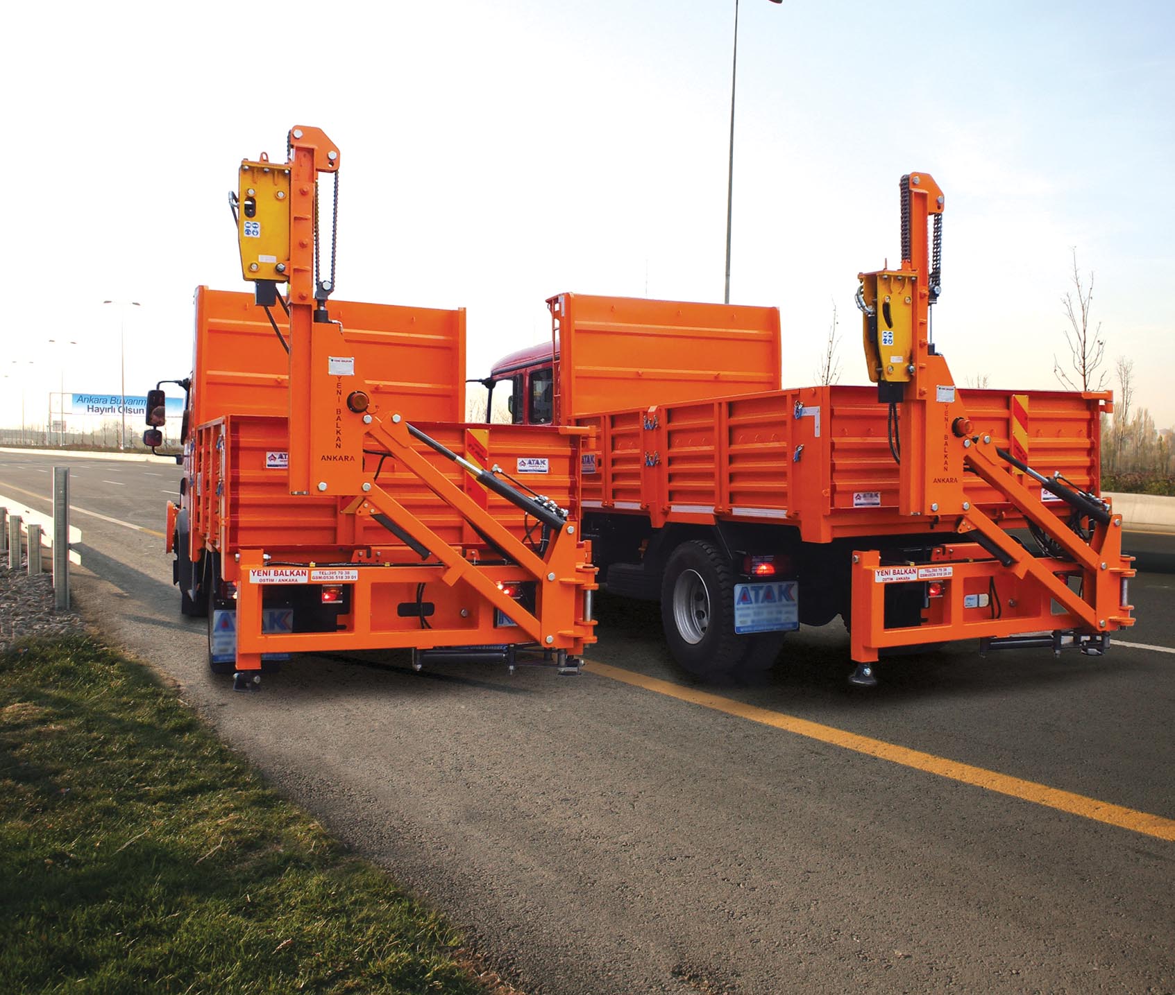 Kamyonun arkasına monte edilen oto korkuluk çakma makinaları, hareket kabiliyeti ve direk, levha, korkuluk taşıma imkanı ile, otoyol çalışmalarında pratik ve hızlı bir çözüm sunar.